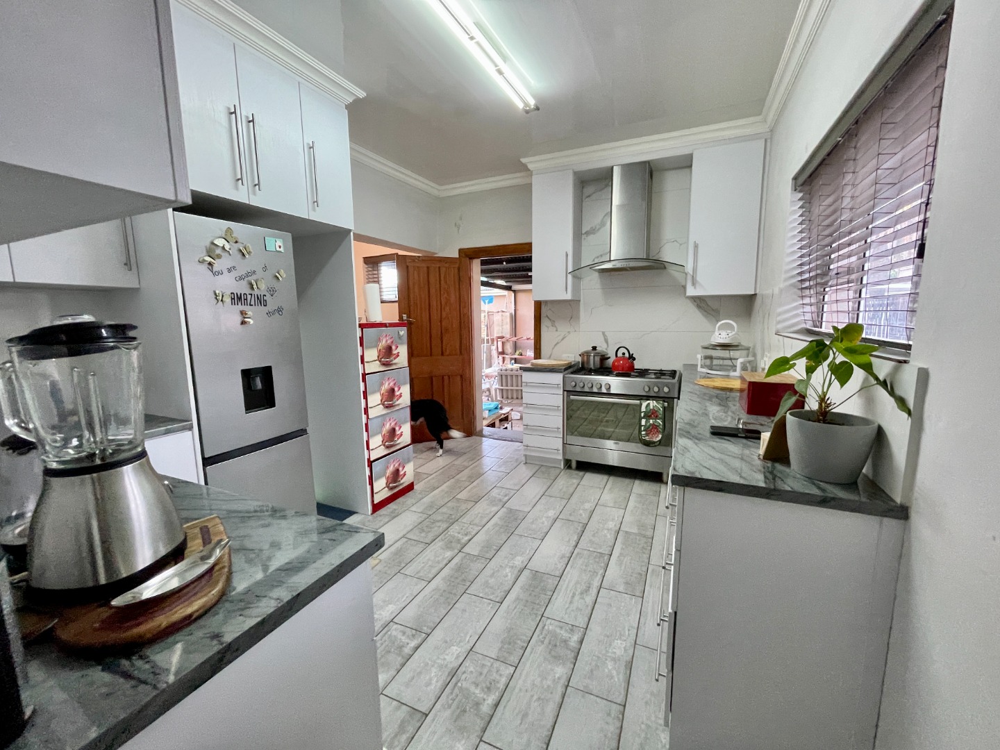 Upon entering the main house, you’re welcomed by a spacious family room featuring a fireplace. Across the passage, the braai room with a built-in braai creates the perfect space for entertaining. A well-appointed guest bedroom with an en-suite bathroom offers a private retreat for visitors. The modern kitchen, complete with a separate scullery, is both stylish and functional—a dream for any home cook.
