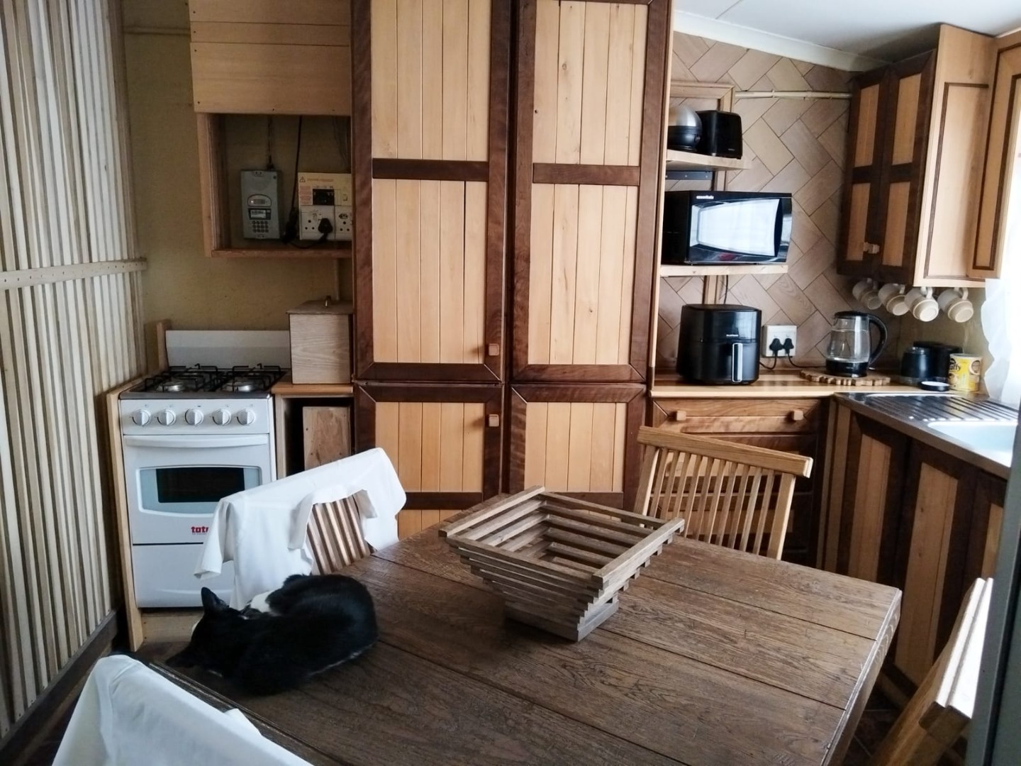 • Functional kitchen with wooden cupboards